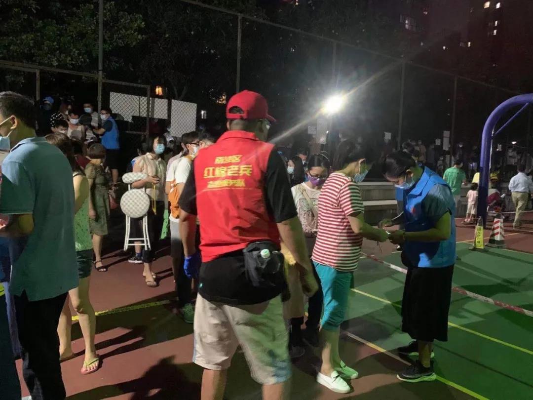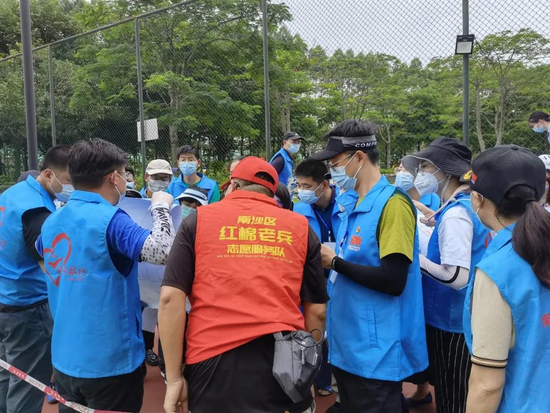 来自党员、退役军人(广州红棉老兵志愿队)、退休老干部、机关部门及企事业单位职工、社区居民等45名志愿者第一时间报名,并在当天中午集结完毕,马上就海庭社区滨海珺城商住区篮球场采样检验点开展场地搭建、维持秩序、测量体温、引导信息填报、检查葵花码等疫情防控工作。从6月5日中午12点到6月6日凌晨四点钟,志愿者们整整奋斗了16个小时,服务来检测社区居民约12000人次,充分发挥了党员先锋示范作用,展现了南沙志愿者凝聚力量、共同抗击疫情的坚定决心和强大行动力,实在令人敬佩。